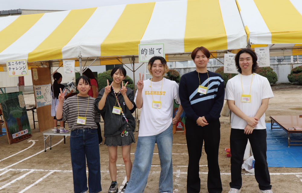 この学生たちは、授業「教師論(初等)」(担当=垣崎授二特任教授)から生まれたグループ「思いやりボーイズ」「思いやりガールズ」の面々。当日は早朝から準備作業に当たり、開会後は「こども縁日」エリアでスマートボールコーナー、ストラックアウトを担当。多くの子どもたちを楽しませていました。