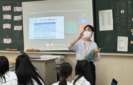 生徒の皆さんは、各自調べた内容を発表用スライドにまとめていました。