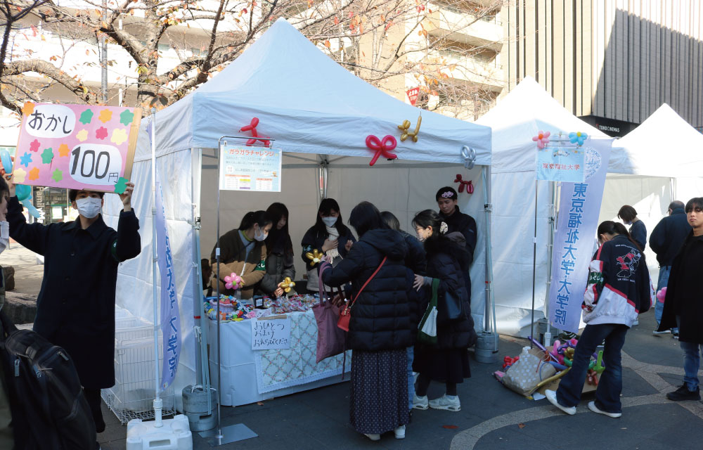 例年12月ごろに池袋駅周辺で開催される、豊島区「ふくし健康まつり」に学生有志が参加し、販売やバルーンアートなどを通してイベントの盛り上げに一役買っています。