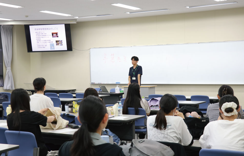 出前授業が行われたのは、保育児童学部・井戸川 敦准教授が担当する「保育キャリア実践演習」の授業内です。当日は、講師として群馬県選挙管理委員会の牛尼 泰智(うしあま たいち)さんが50分間にわたり選挙に関する講義を行いました。