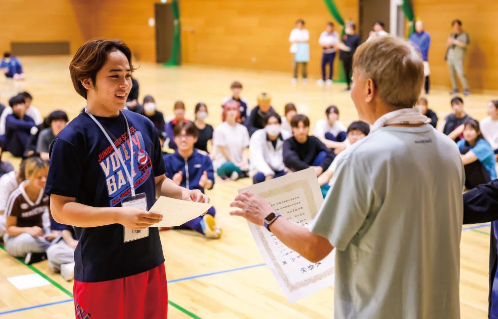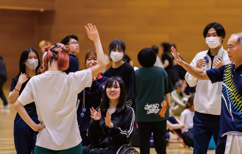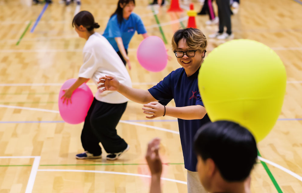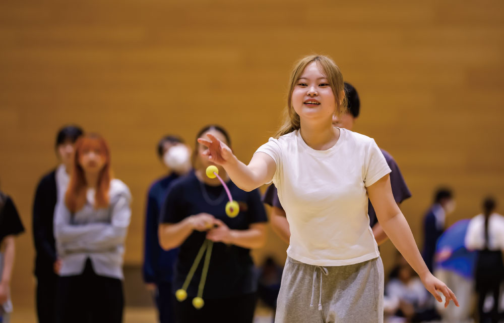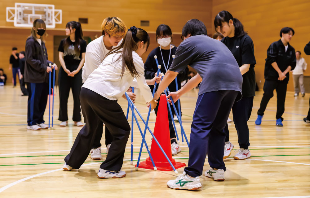 参加学生たちは広い体育館いっぱいに広がり、チームに分かれて5つの種目を1つずつ体験し、獲得した点数をつけていきました。ひもでつながっている2個のボールを、ラダー(はしご)に向かって投げる「ラダーゲッター」では、思わぬボールの動きに四苦八苦。タイミングよくラダーに引っ掛けることができると、チーム全員でハイタッチをして喜び合う様子が見られました。教員も学生たちに声をかけながら一緒に笑顔で参加し、チーム一丸となって汗を流していました。